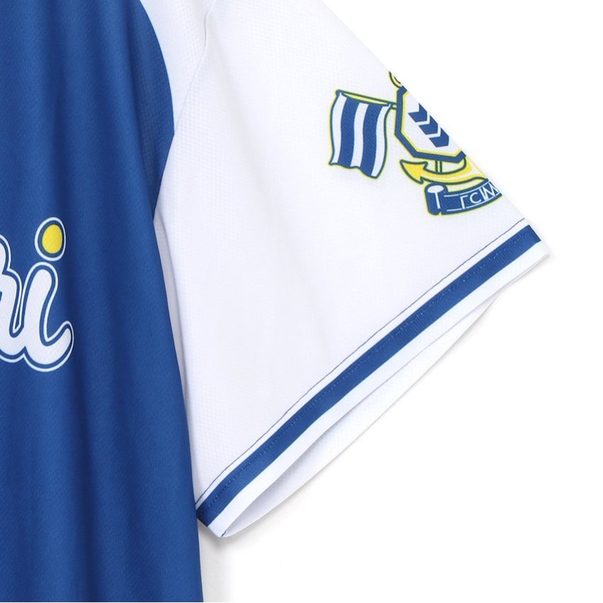 人気のベースボールシャツ、今シーズンはブルーとホワイトの2トーンカラーにポップなロゴがレイアウト。
