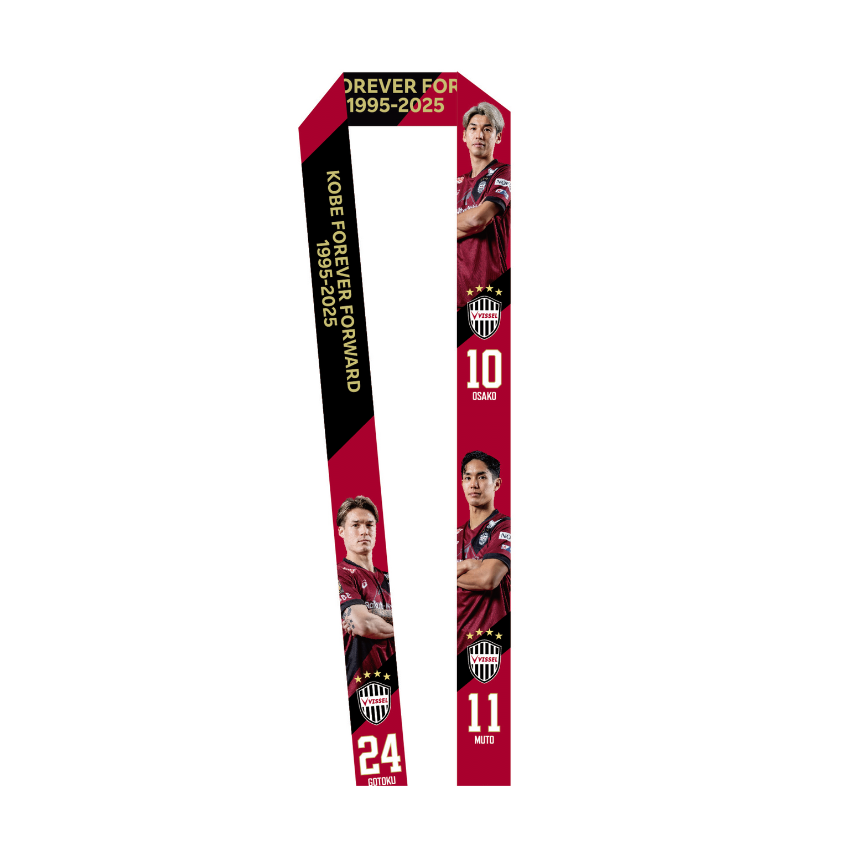 2025年ユニフォームデザインをベースに大迫選手、武藤選手、酒井選手がプリントされたショルダーストラップです。IDカードや社員証などをスタイリッシュに持ち運びながら、さりげなくヴィッセル神戸をアピール。アジャスター付きで長さ調節可能なので、普段使いに最適です。