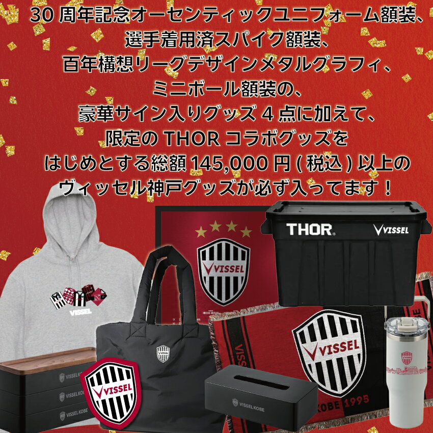 THOR、山崎実業コラボグッズや、福袋限定のグッズ(メタルグラフィカレンダーA3・刺繍パーカー・シングルサイズブランケット)など、従来のヴィッセルグッズを含む総額145,000円相当のヴィッセル神戸グッズが入っております!