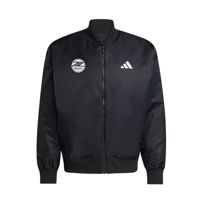 シンプルなブラックカラーに、胸元のエンブレムが映えるボンバージャケット。
