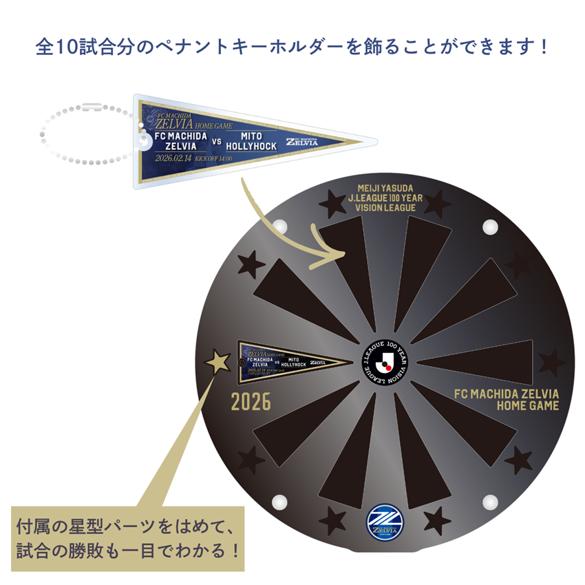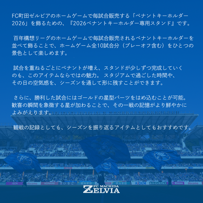 FC町田ゼルビアのホームゲームで毎試合販売する「ペナントキーホルダー2026」を飾るための、
