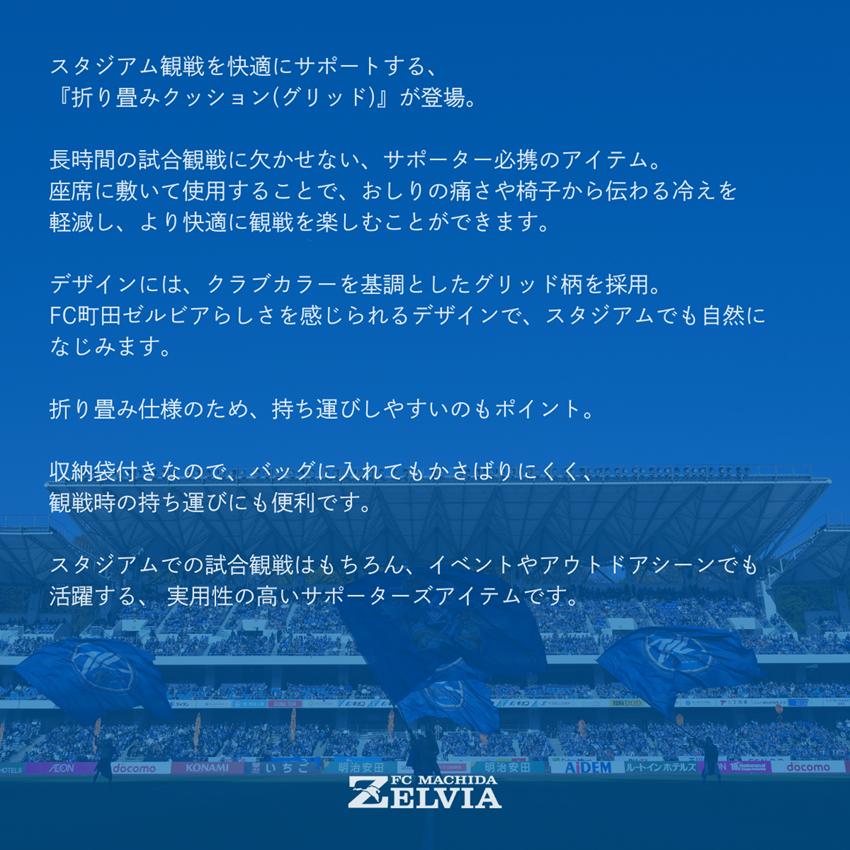 スタジアム観戦を快適にサポートする、 『折り畳みクッション(グリッド)』が登場。