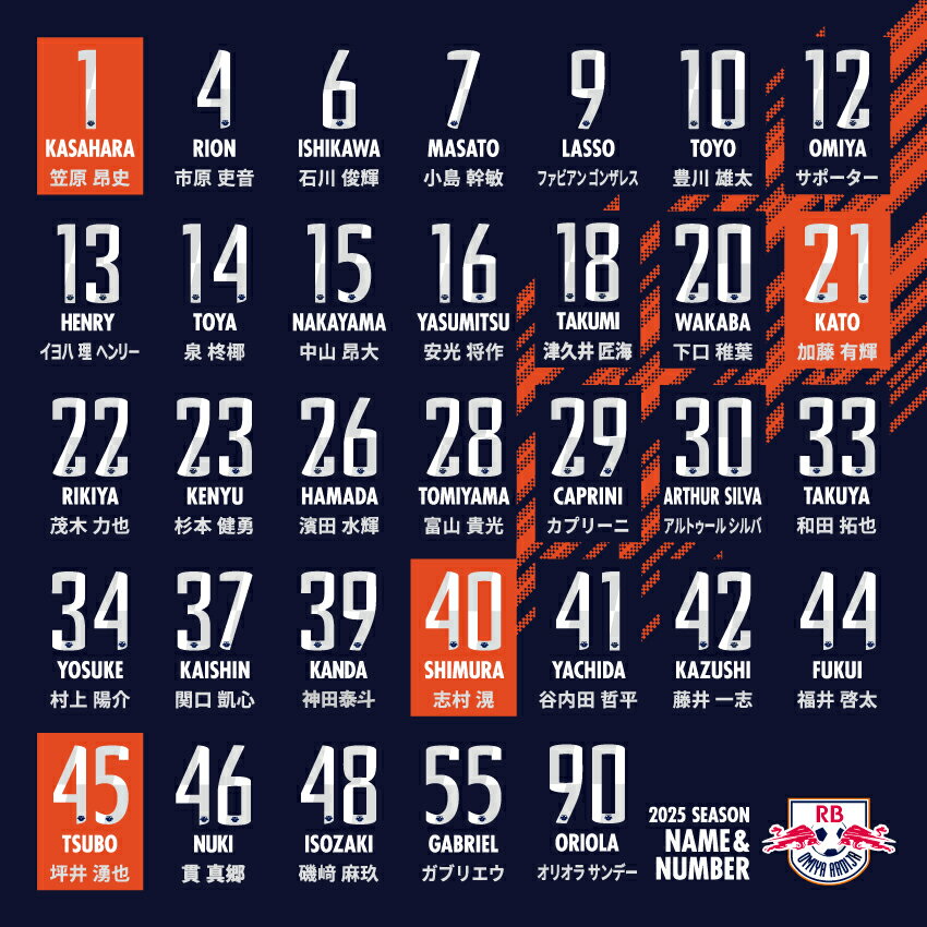 「RB大宮アルディージャ」オリジナルナンバーフォントにエンブレムをデザインしたオリジナルネーム&ナンバーシートでの圧着加工になります。FP1st(ネイビー)およびGK1st(オレンジ)はホワイト&グレーシート、FP2nd(ホワイト) はネイビー&ブルーシートでの圧着加工になります。