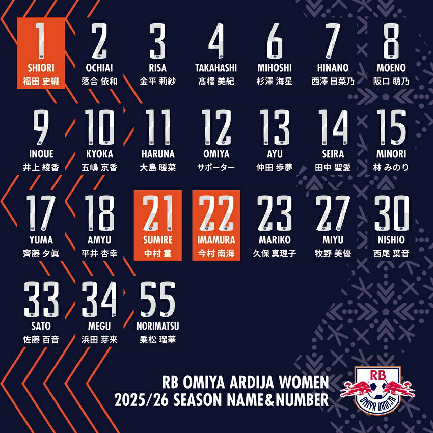 「RB大宮アルディージャWOMEN」オリジナルナンバーフォントにエンブレムをデザインしたオリジナルネーム&ナンバーシートでの圧着加工になります。FP1st(ネイビー)およびGK1st(オレンジ)はホワイト&グレーシート、FP2nd(ホワイト) はネイビー&ブルーシートでの圧着加工になります。