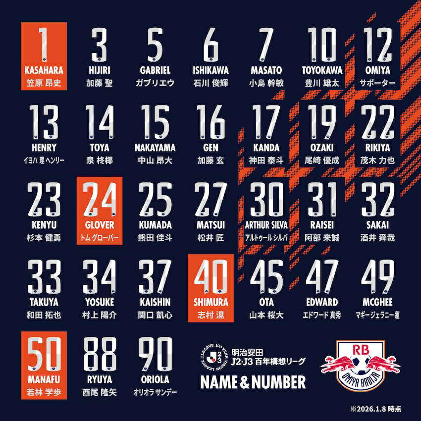 「RB大宮アルディージャ」オリジナルナンバーフォントにエンブレムをデザインしたオリジナルネーム&ナンバーシートでの圧着加工になります。FP1st(ネイビー)およびGK1st(オレンジ)はホワイト&グレーシート、FP2nd(ホワイト) はネイビー&ブルーシートでの圧着加工になります。