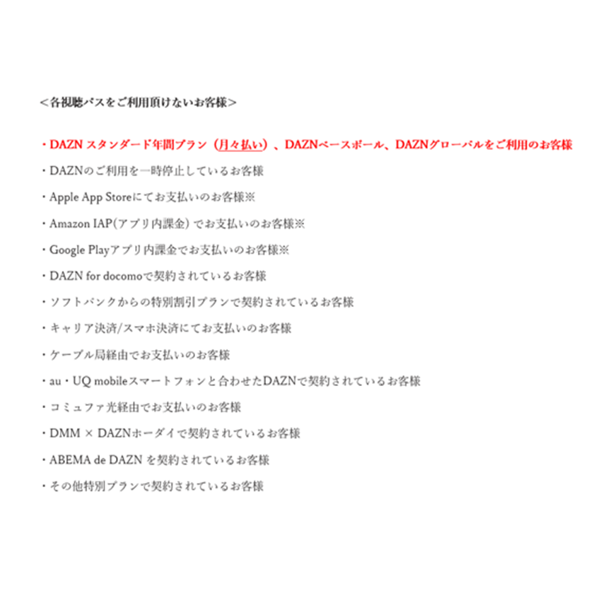 ※過去にDAZN年間視聴パスをご購入・ご利用頂いている方で、特定の条件に該当するお客様以外(画像2枚目を参照)は、現存のアカウントを引き続きご利用いただけます。(※退会の必要はございません)