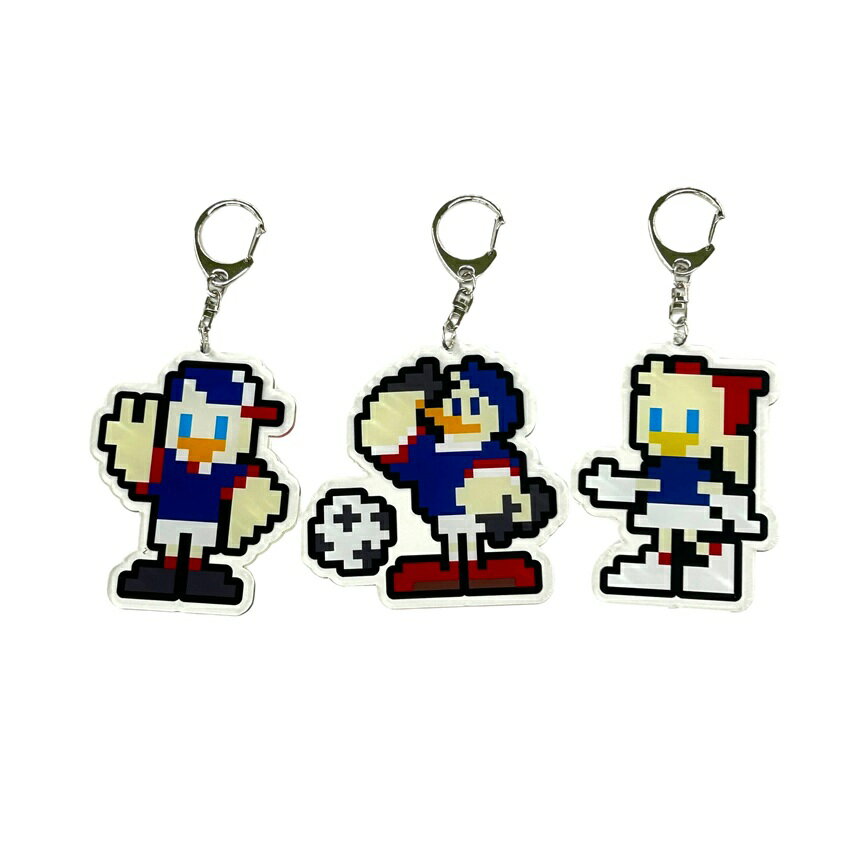 ・レトロなゲーム風のピクセルでマスコットがデザインされたアクリルキーホルダー